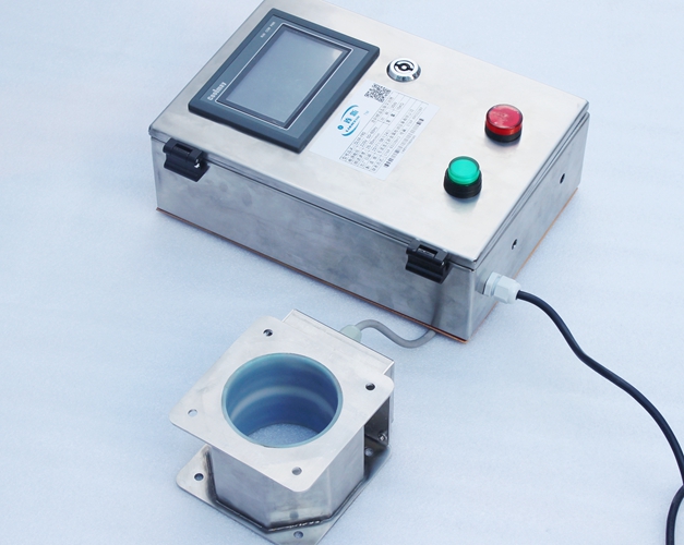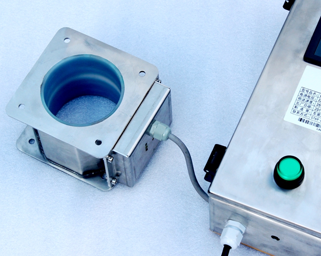 原料從料斗或送料器自由下落進(jìn)入金屬分離器,如果沒有金屬雜質(zhì),原料會(huì)直接通過金屬分離器流向下端的出料口。如果檢測(cè)器檢測(cè)到原料中含有金屬,那么控制器立刻啟動(dòng)分離板將金屬物和部分原料一起導(dǎo)向側(cè)面的排料口,然后分流板迅速恢復(fù)至正常的位置,分流板速度可調(diào),金屬分離器的檢測(cè)精度也可根據(jù)生產(chǎn)需要調(diào)節(jié),最小可檢測(cè)并分離出Φ 0.2mm的金屬顆粒。